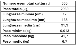 Sono stati catturati complessivamente 8 esemplari di siluro, per un peso complessivo stimato pari a circa 200 kg. La lunghezza media degli esemplari catturati è stata di circa 135 cm; l’esemplare di taglia maggiore aveva una lunghezza di 196 cm e un peso stimato di circa 60 kg.