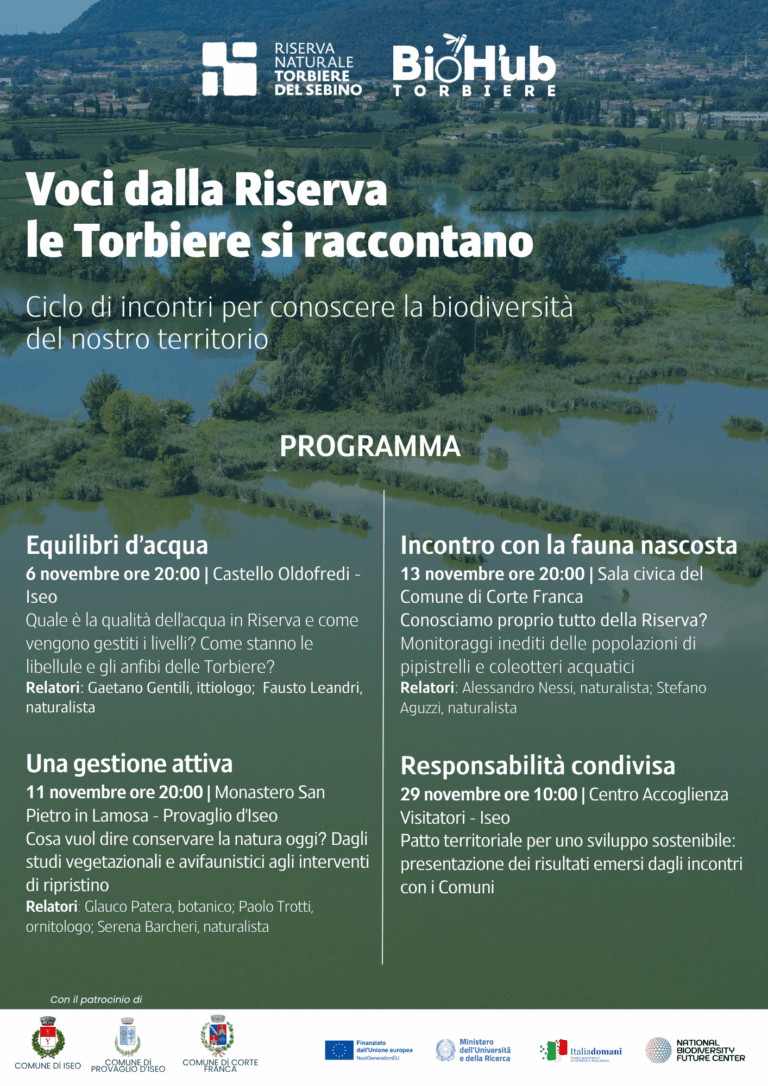 La Riserva Naturale delle Torbiere del Sebino conclude il progetto BioHub Torbiere con un ciclo di incontri itineranti dal titolo “Voci dalla Riserva – le Torbiere di raccontano” che mira a condividere con la comunità locale i risultati di due anni di monitoraggi, studi scientifici e attività di educazione ambientale, restituendo un quadro ricco e aggiornato della biodiversità del territorio.